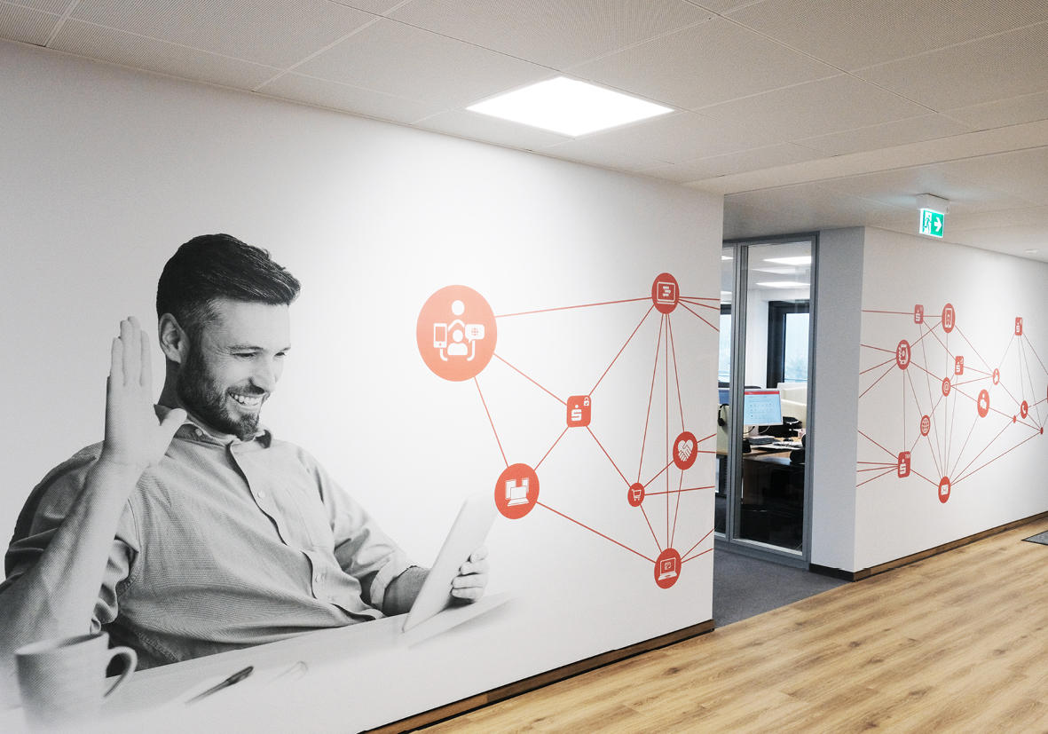 In dit kantoor is de volledige huisstijl van het bedrijf op de muur aangebracht, met een haarscherpe foto en strak uitgevoerde lijnen die perfect aansluiten bij de bedrijfsidentiteit.
