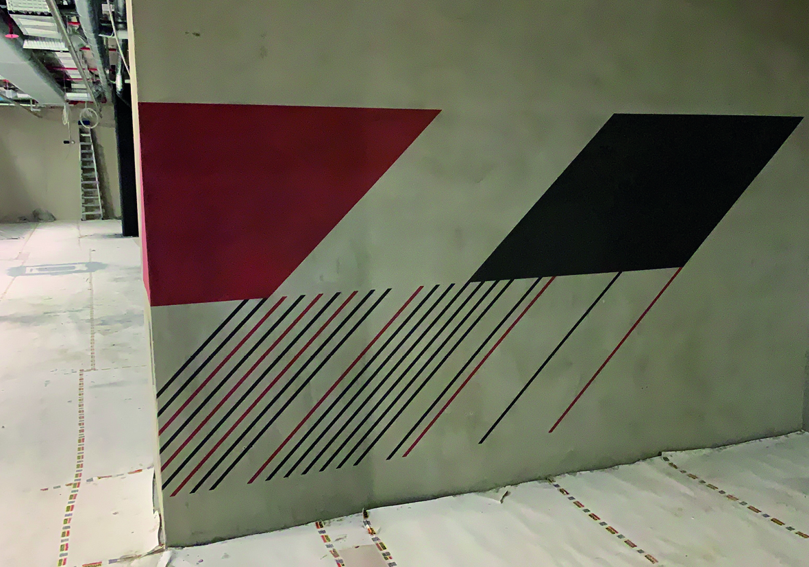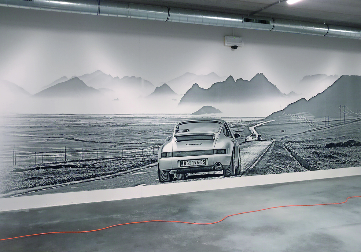Muurprint in een garage, aangebracht op een glad gestucte wand.