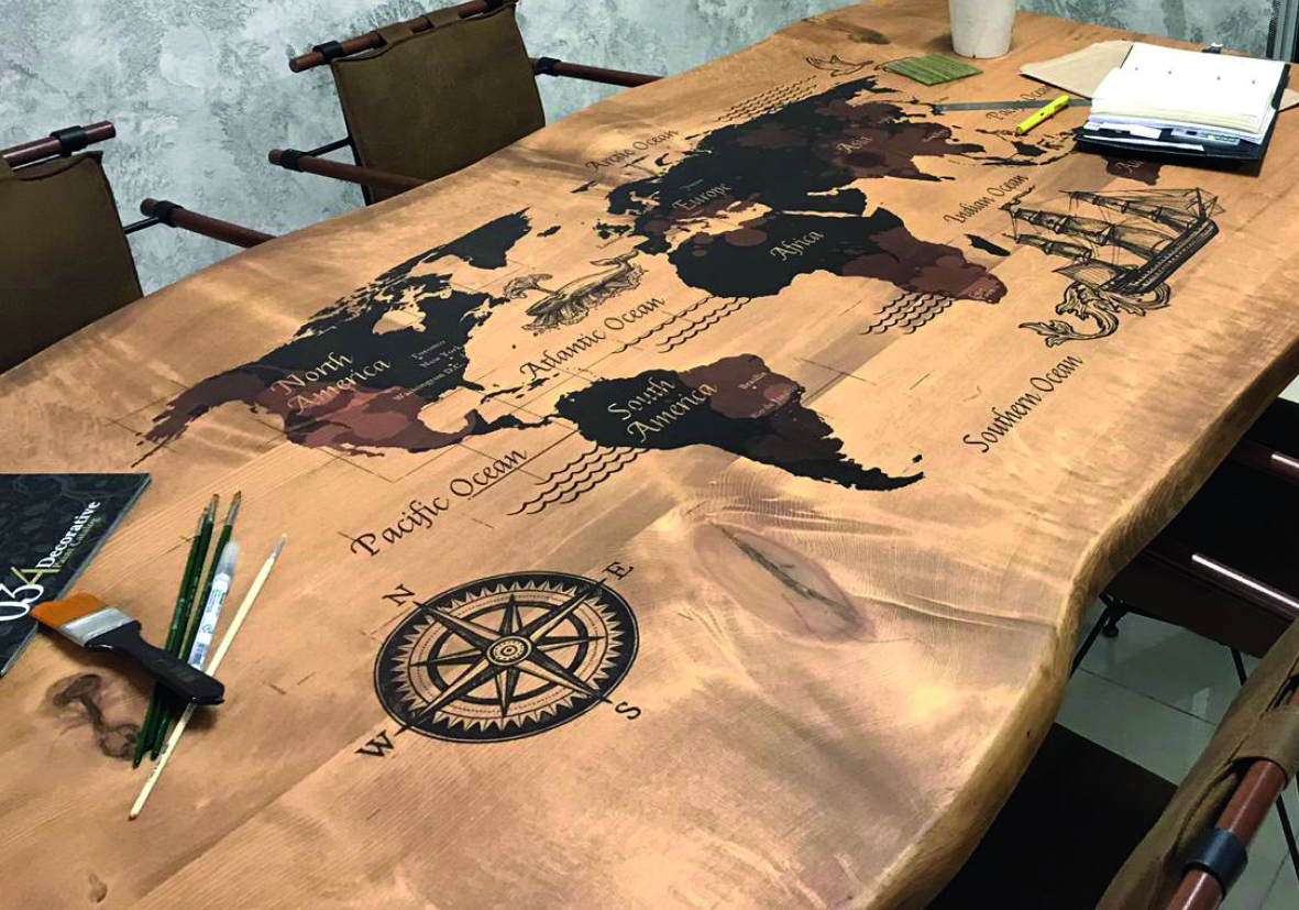 Deze tafel is met een gedetailleerde landschapskaart omgetoverd tot een uniek en persoonlijk meubelstuk.