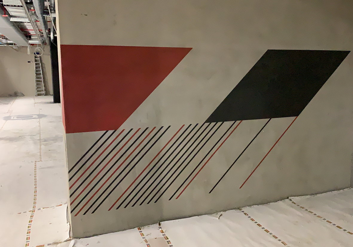 Muurprint in een garage, aangebracht op een glad gestucte wand.